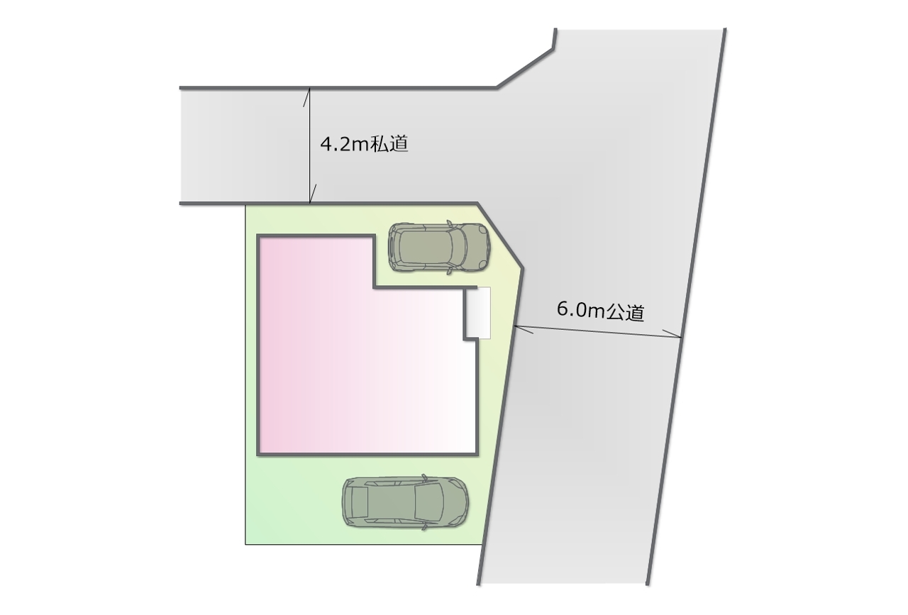 | 接道 | 東側6M公道に接道 北側4.2M私道に接道 |