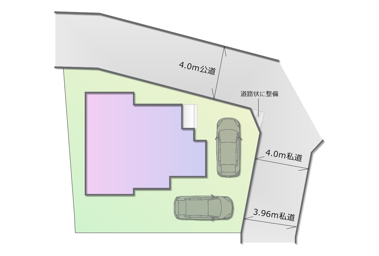 | 接道 | 北東側1.82M公道に接道 南東側4M私道に接道 |